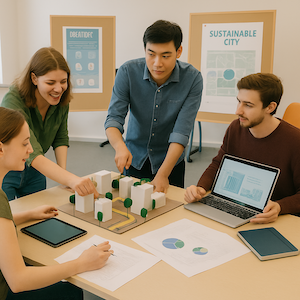 Im Rahmen eines Seminars zur nachhaltigen Stadtentwicklung dient das Ideenlabor als kreative Werkstatt. Studierende arbeiten in interdisziplinären Teams an konkreten Herausforderungen urbaner Lebensräume, etwa zur Mobilität, Begrünung oder sozialen Teilhabe. Mithilfe modularer Materialien und technischer Ausstattung entstehen erste Prototypen – von Modellen über visuelle Pläne bis hin zu digitalen Präsentationen. Die flexible Umgebung des Ideenlabors fördert den Austausch, das Testen von Ideen und eine praxisnahe Projektarbeit.