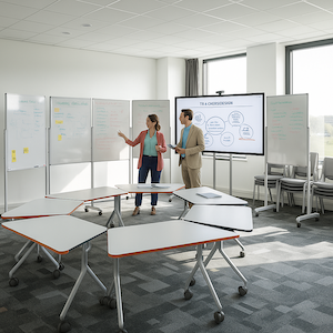 Eine Lehrperson plant ein Seminar, in dem fachliche Inputs mit Gruppenarbeit kombiniert werden. Ziel ist es, zentrale Inhalte nicht nur zu vermitteln, sondern direkt an Fallbeispielen anwenden zu lassen. Dafür eignet sich ein Raum mit flexibler Möblierung, der schnelle Übergänge zwischen Plenum und Gruppenarbeit sowie Gruppenrotation ermöglicht. Mobile Whiteboards unterstützen die Visualisierung von Ergebnissen.