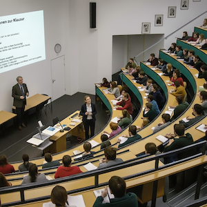 80 Studierende schreiben ihre Klausur in einem grossen Hörsaal. Vier Aufsichtspersonen sind vor Ort, sodass alle Seiten des Raums im Blick bleiben. Zu Beginn werden die Regeln klar kommuniziert und über den Beamer visualisiert: Dauer, erlaubte Hilfsmittel und der Ablauf.