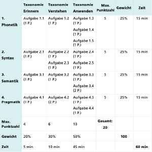 In einer Einführungsveranstaltung zur Linguistik werden alle zentralen Themen – Phonetik, Syntax, Semantik und Pragmatik – im Blueprint gleich gewichtet, da sie in der Veranstaltung vergleichbar stark behandelt werden. Innerhalb der Themen werden höhere Taxonomiestufen durch eine höhere Anzahl Prüfungsfragen höher bewertet als die niedrigeren Taxonomiestufen. So können alle Themen gleichwertig, aber kognitiv differenziert geprüft werden.