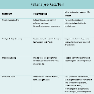 Im Studiengang Gesundheitswissenschaften analysieren die Studierenden eine interprofessionelle Betreuungssituation. Die Aufgabe verlangt, das Problem systematisch zu erfassen, relevante Fachtheorien anzuwenden und eine begründete Empfehlung zu formulieren. Die schriftliche Ausarbeitung wird mit einem Pass/Fail-Schema bewertet. Dabei zählen die Erfüllung zentraler Kriterien und Mindestanforderungen: Pass wird nur dann vergeben, wenn alle vier Kriterien erfüllt sind.